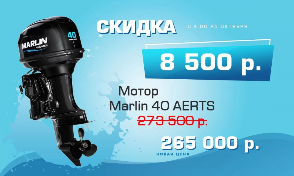 Только с 4 по 25 октября 2021 г. снижаем цены до 8 500 рублей! Не упустите возможность сейчас выгодно приобрести качественный мотор Marlin!